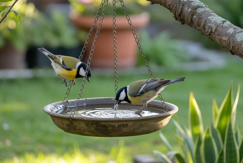 You can hang mason jars upside-down with a shallow dish attached to the lid as a drip system. This is ideal for gardeners who want a minimalist or rustic look. Birds are naturally curious and will explore the small water source.