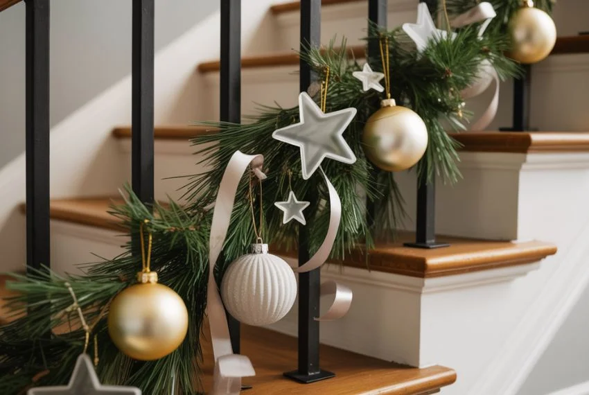 Hanging ornaments along your garland adds visual interest without overwhelming the staircase. Use different sizes for depth but keep the style consistent for harmony.