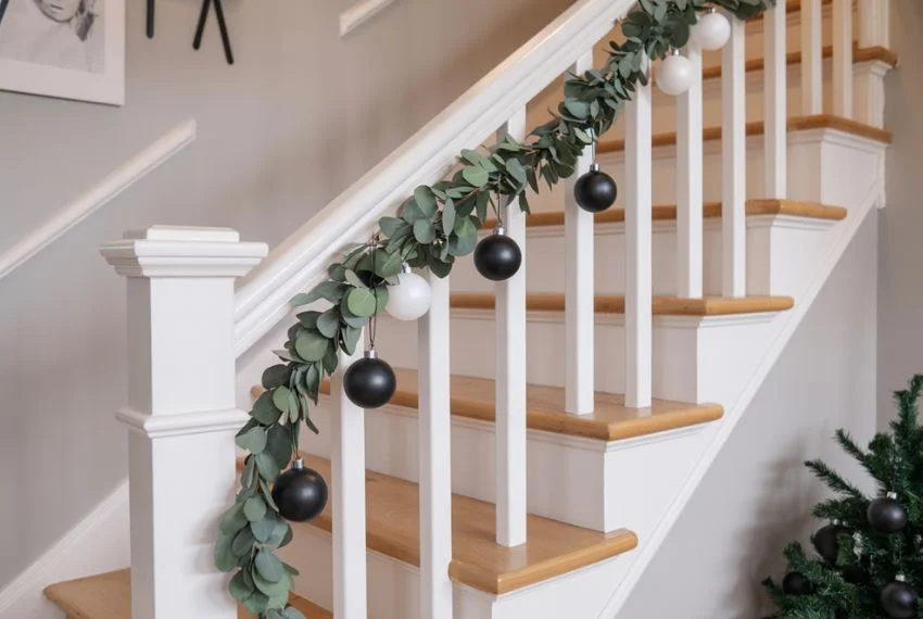Next, add minimal accents such as matte ornaments, black ribbons, or sleek metal bells. Keep the décor balanced—avoid overcrowding the railing. The goal is sophistication, not clutter.