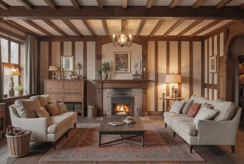 Key Tudor characteristics include exposed timber framing, stucco or brick infill, tall chimneys, narrow or grouped windows, and asymmetrical facades. Interiors often feature heavy wood beams, plaster walls, arched doorways, and handcrafted details.